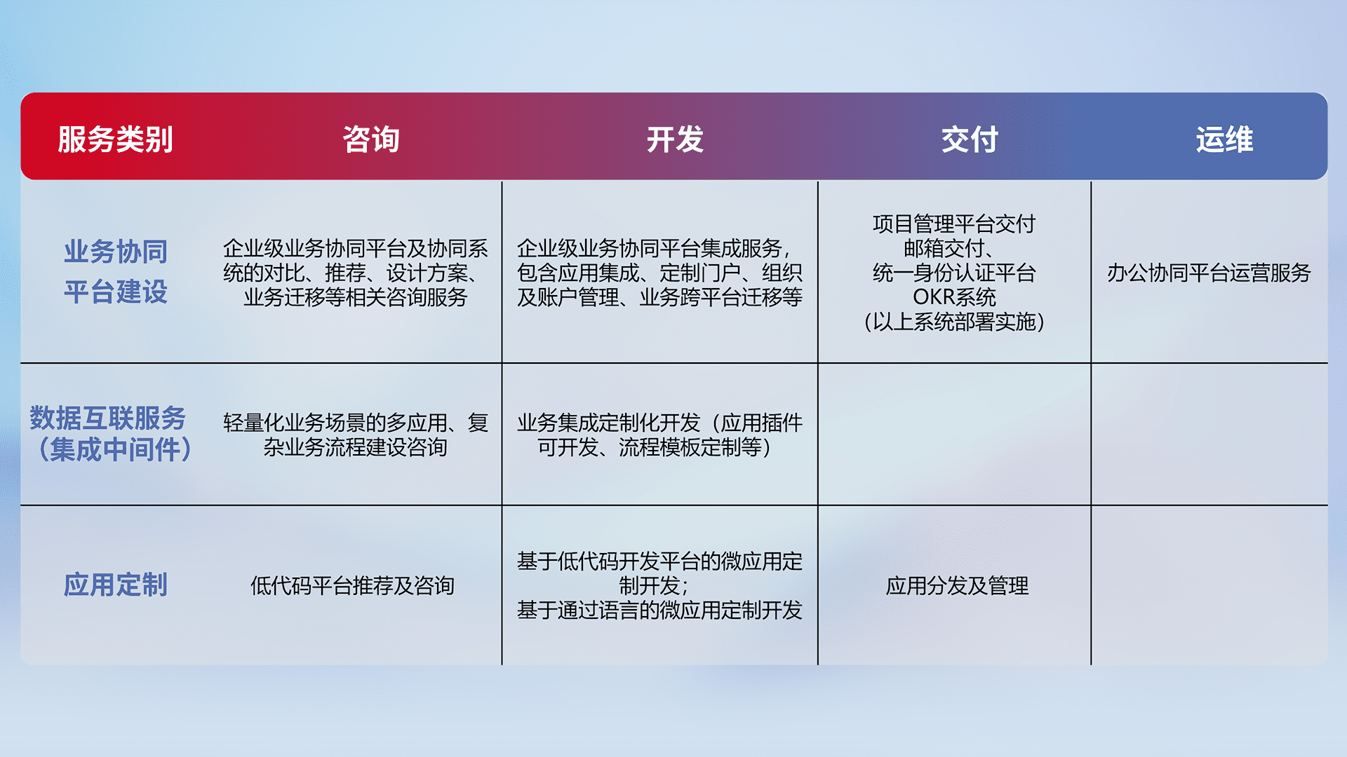 针对钉钉、、企微、、、IDaas等平台级产品提供产品的规划、、、方案、、、、交付、、、定制化开发等服务,,,实现如统一协同办公、、智能客户服务、、混合会议管理、、智能数据查询、、、等业务场景,,,实现数字化转型。。。。
