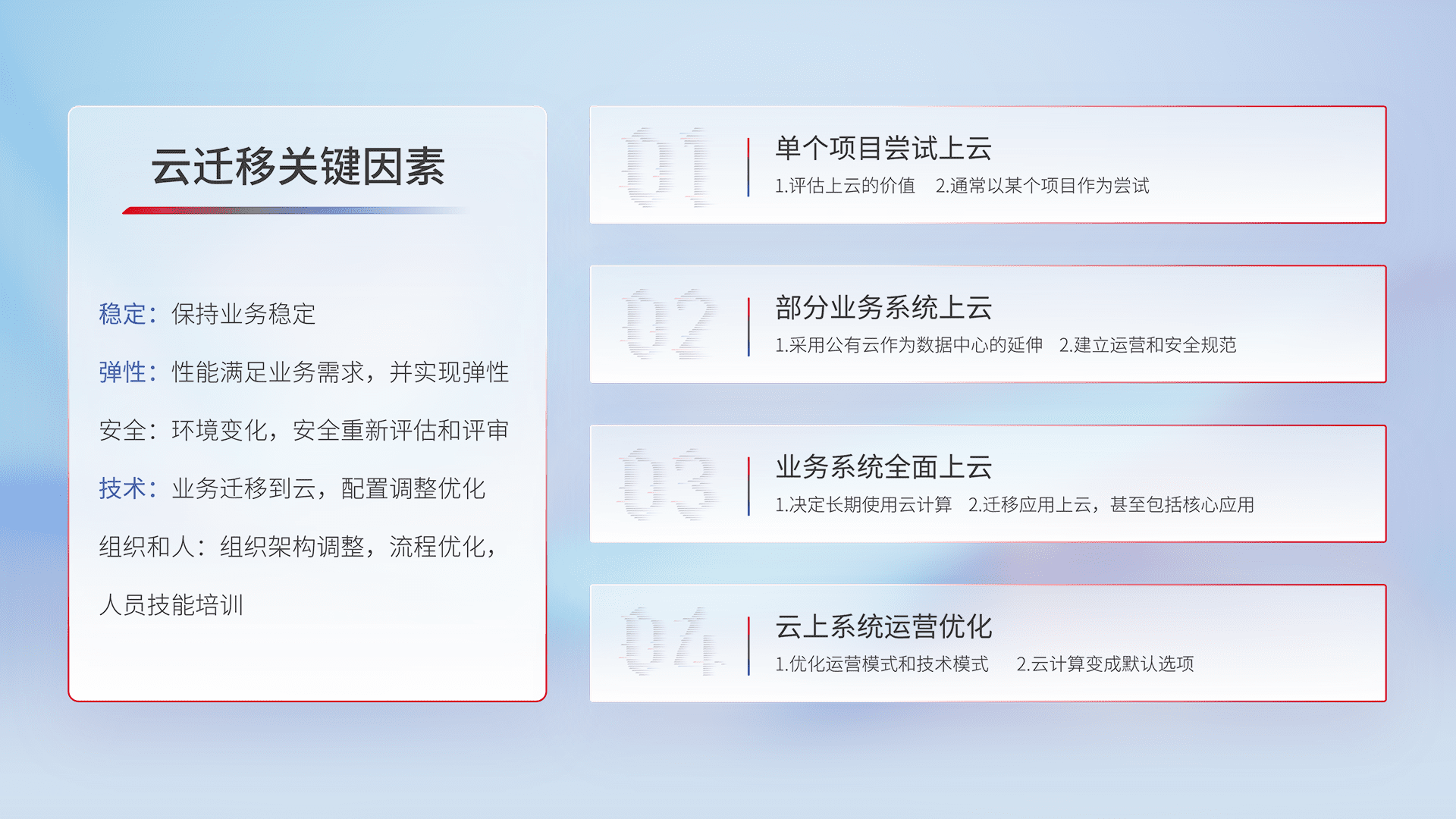 结合实际业务,,,从规划设计、、云平台选型、、、、云原生改造、、数据迁移、、、集成交付,,,迁移全过程为客户识别最佳上云路径,,做好风险识别管理,,,,设计网络架构、、身份权限、、、、安全审计合规、、、、操作审计、、、日志审计、、监控告警策略、、、、多站点容灾设计等,,,对云上基础设施进行整体规划,,,提升IT治理水平,,,以满足弹性、、、高可用、、、高性能的需求。。